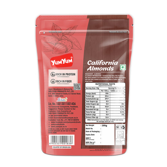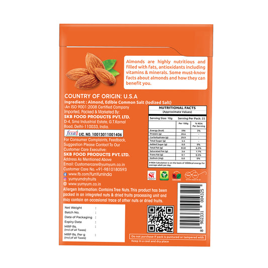 Yum Yum Almonds , typically used as a snack or as an ingredient in various recipes. Almonds are known for their rich, nutty flavor and dietary advantages, including being a decent wellspring of solid fats, protein, fiber, nutrients, and minerals.